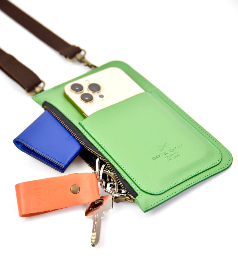 El Phone Sling es un accesorio diseñado para que tus llaves, tus tarjetas, tu dinero y tu móvil vayan bien protegidos. Creado para lucirse, este accesorio combina la piel de primera calidad con una correa regulable en algodón ultrarresistente.