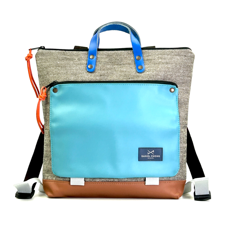 Mochila unisex en formato cuadrado para poder llevar un portátil de 13’’ o una tablet en modo horizontal. Con un bolsillo exterior, de piel vegana anti rozaduras y cremallera, con soporte para libros o revistas.