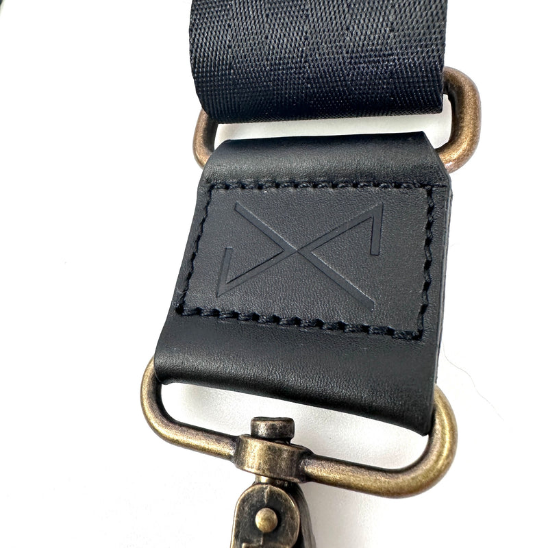 Bandolera para bolsos, en cinta de poliester reciclado, con las puntas acabadas en piel, lujadas y grabadas con nuestro anagrama.