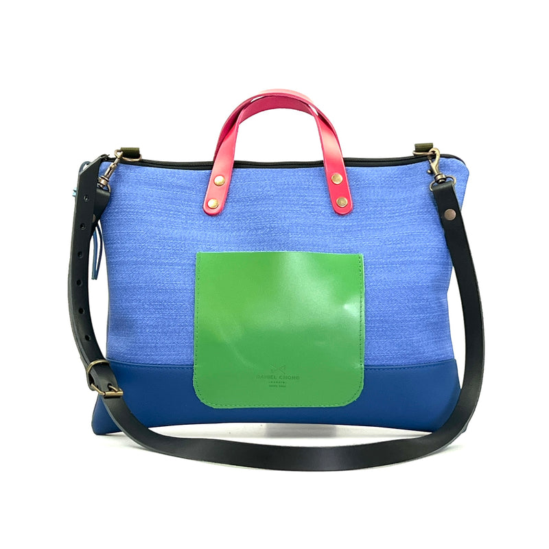 Bolso unisex y minimalista, con bolsillo exterior de piel con logo grabado. Ultraligera con asas de piel y correa regulable de curtición vegetal.
