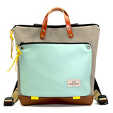 Mochila unisex en formato cuadrado para poder llevar un portátil de 13’’ o una tablet en modo horizontal. Con un bolsillo exterior, de piel vegana anti rozaduras y cremallera, con soporte para libros o revistas.