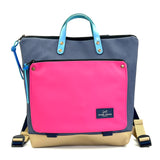 Mochila unisex en formato cuadrado para poder llevar un portátil de 13’’ o una tablet en modo horizontal. Con un bolsillo exterior, de piel vegana anti rozaduras y cremallera, con soporte para libros o revistas.