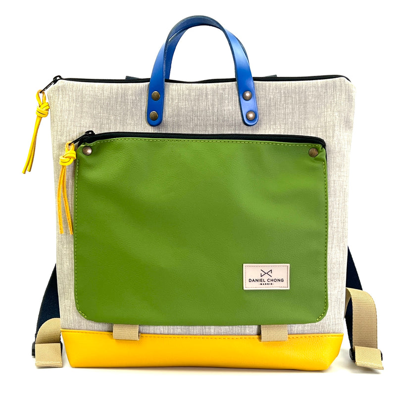 Mochila unisex en formato cuadrado para poder llevar un portátil de 13’’ o una tablet en modo horizontal. Con un bolsillo exterior, de piel vegana anti rozaduras y cremallera, con soporte para libros o revistas.