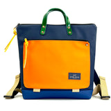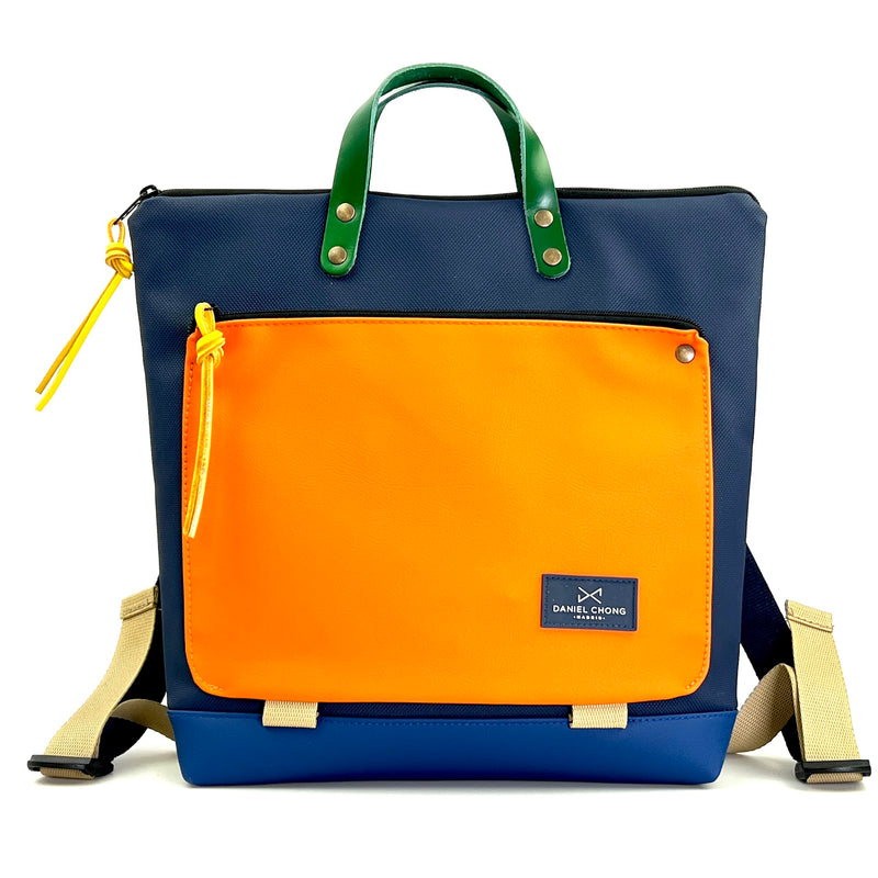 Mochila unisex en formato cuadrado para poder llevar un portátil de 13’’ o una tablet en modo horizontal. Con un bolsillo exterior, de piel vegana anti rozaduras y cremallera, con soporte para libros o revistas.