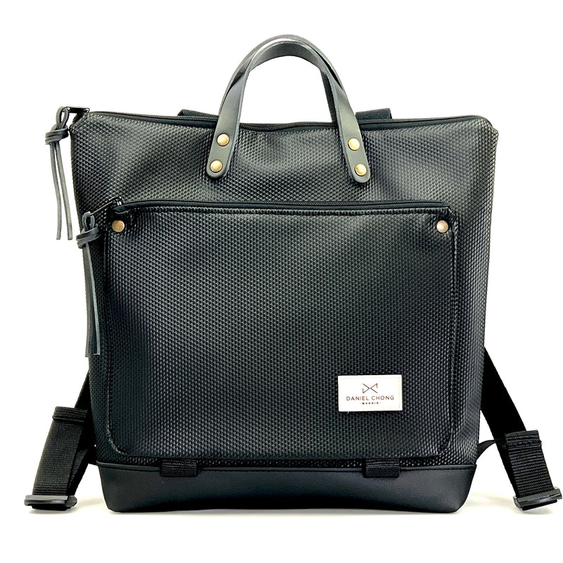 Mochila unisex en formato cuadrado para poder llevar un portátil de 13’’ o una tablet en modo horizontal. Con un bolsillo exterior, de piel vegana anti rozaduras y cremallera, con soporte para libros o revistas.