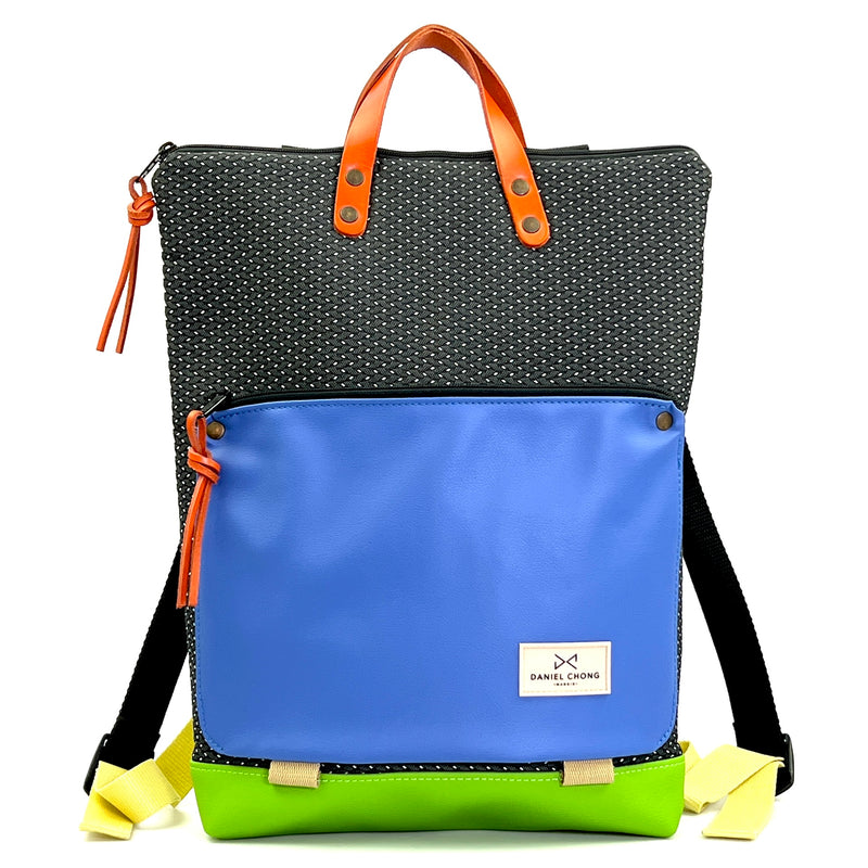 Mochila unisex. Además de su forma plana, cuenta con un bolsillo exterior de piel vegana anti rozaduras con cremallera y soporte para llevar un libro o revista.