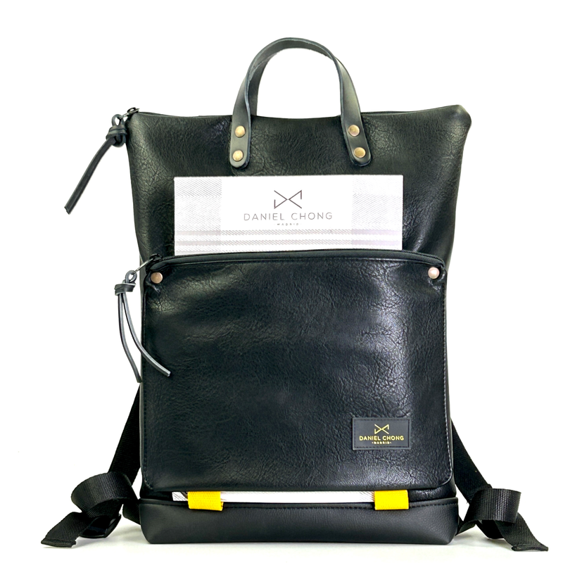 Mochila unisex. Además de su forma plana, cuenta con un bolsillo exterior de piel vegana anti rozaduras con cremallera y soporte para llevar un libro o revista.