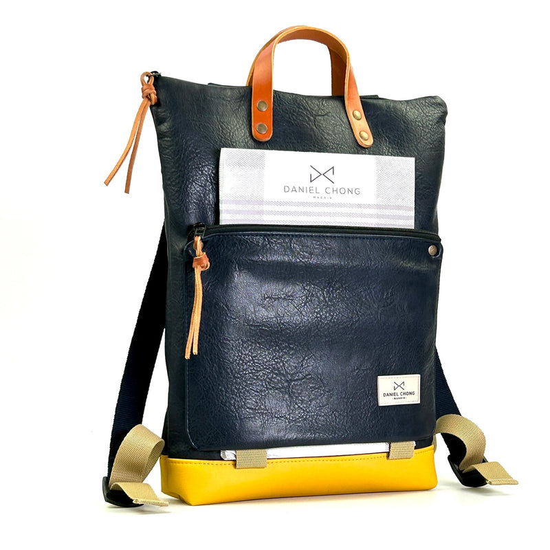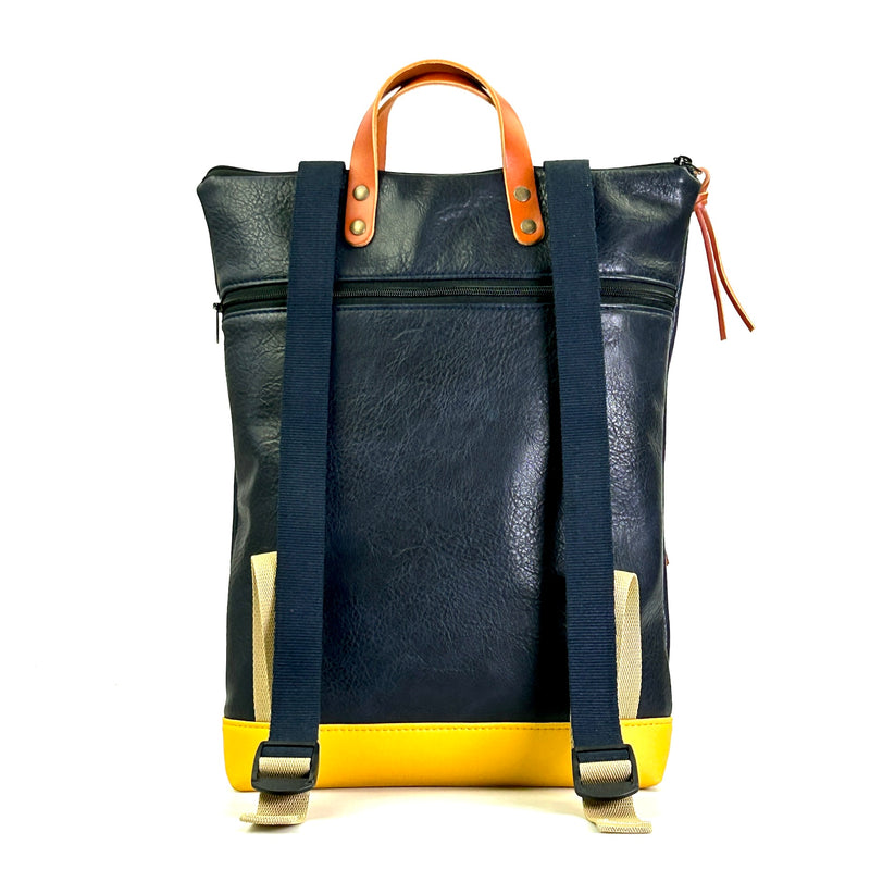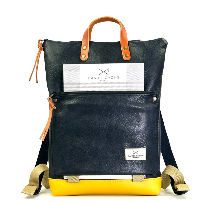 Mochila unisex. Además de su forma plana, cuenta con un bolsillo exterior de piel vegana anti rozaduras con cremallera y soporte para llevar un libro o revista.