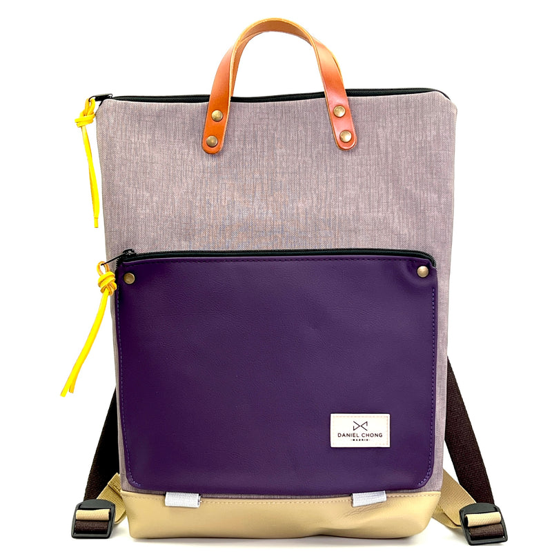 Mochila unisex. Además de su forma plana, cuenta con un bolsillo exterior de piel vegana anti rozaduras con cremallera y soporte para llevar un libro o revista.