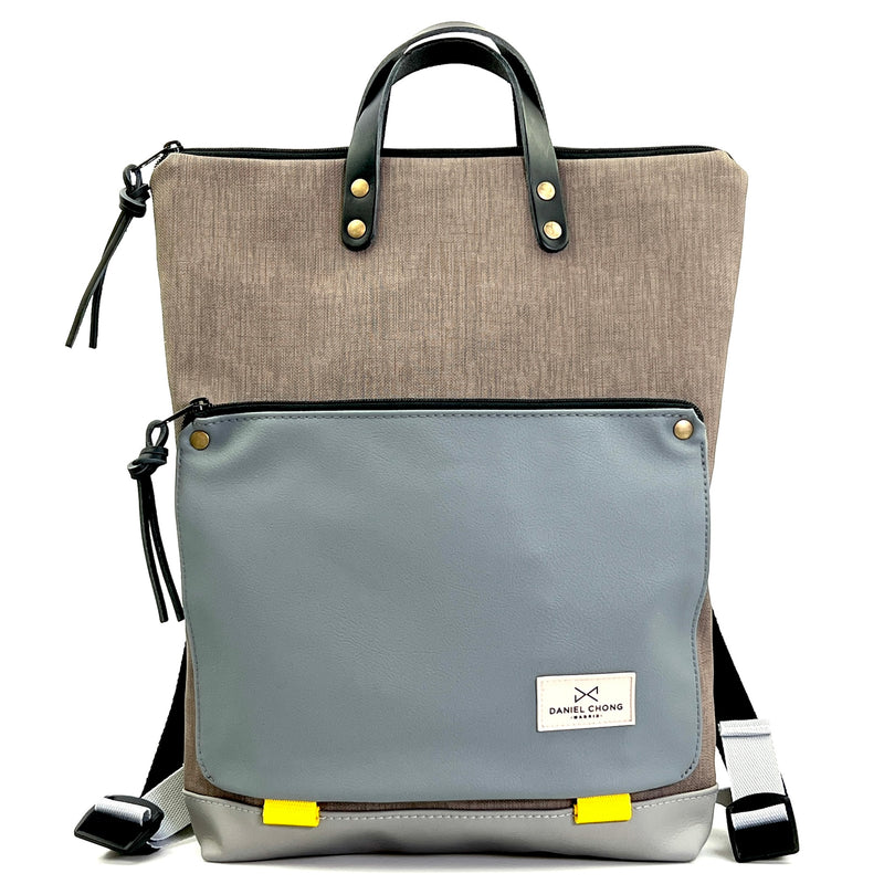 Mochila unisex. Además de su forma plana, cuenta con un bolsillo exterior de piel vegana anti rozaduras con cremallera y soporte para llevar un libro o revista.