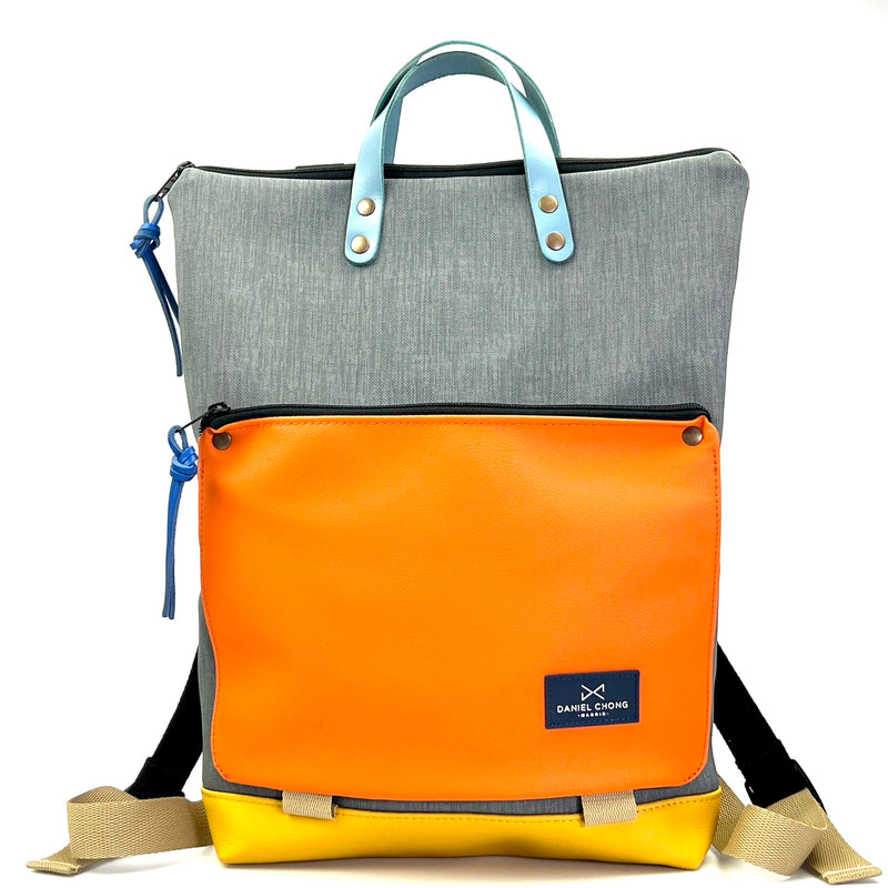 Mochila unisex. Además de su forma plana, cuenta con un bolsillo exterior de piel vegana anti rozaduras con cremallera y soporte para llevar un libro o revista.