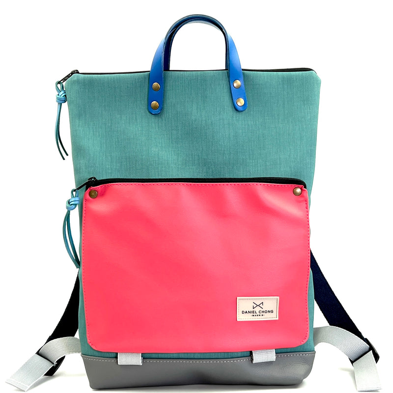 Mochila unisex. Además de su forma plana, cuenta con un bolsillo exterior de piel vegana anti rozaduras con cremallera y soporte para llevar un libro o revista.