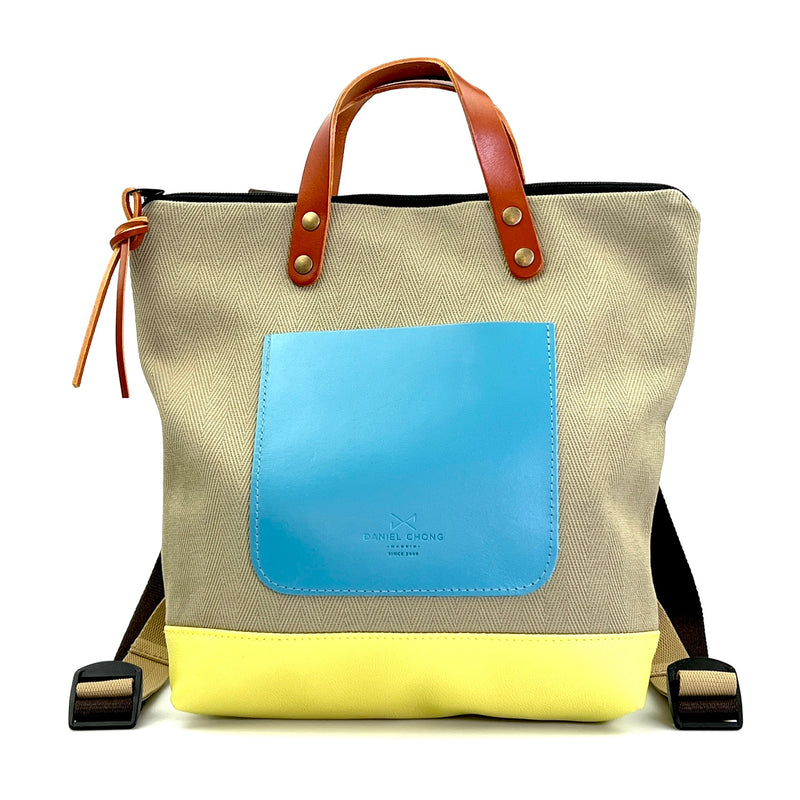 Mochila en formato cuadrado, ultraligera con bolsillo central con logo grabado en piel y con espacio para tu tablet.